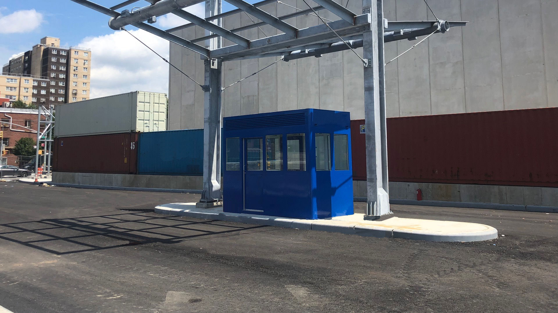 The Steiner Studios located in Brooklyn, New York purchased years ago a Mardan prefabricated aluminum guard shelter. They decided it was time to upgrade, after many many years of excellent use,. They decided to purchase this 6′ x 12′ prefab guard shelter. The guard shelter includes radius corners, custom louvers, two sliding doors and painted blue exterior. The guard shelter also has roof-mounted A/c with a wall heater.